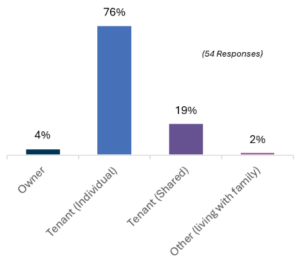 Education levels were notably high, with 62% having completed university degrees, and an additional 26% having some university education. Only a small percentage had limited formal education, with 2% reporting no schooling at all. The tenants’ marital statuses were evenly divided: 48% were single at the time of the survey, while another 48% were married or cohabitating, and a small 4% were separated or divorced.