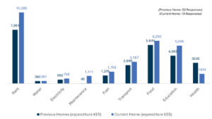 Household expenditure among tenants varied widely, reflecting the diverse income levels amongst the residents. In previous homes, tenants were spending between KES 8,000 and KES 130,400, with the mean expenditure totalling KES 20,300. On average, monthly spending increased slightly with a mean expenditure of KES 23,450. Expenditure ranged from KES 12,600 to a maximum of KES 85,000 across the whole sample, showing a decrease in the extremes of the spending, but a general trend in increases expenditure across the minimum and interquartile range. Most households fell within an interquartile range of KES 16,335 to KES 36,150.
